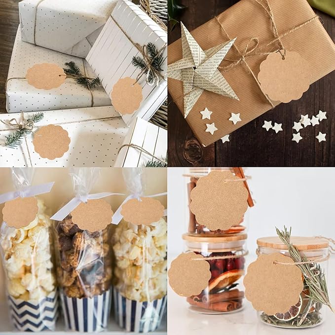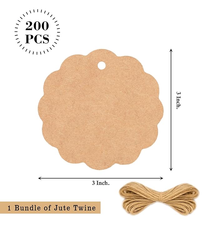 Kraft Scalloped Shaped Paper Tags with Jute Twine, Pack of 200