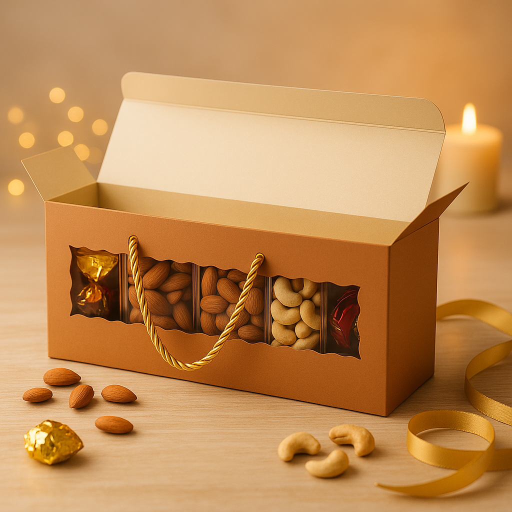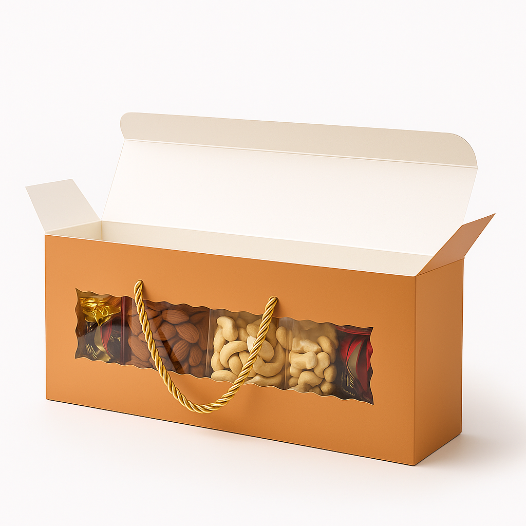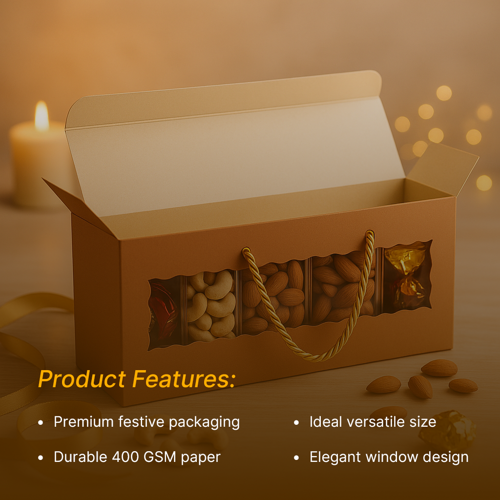 Make festive gifting effortless and elegant with Mudrit Hamper Gift Boxes. Designed for celebrations big and small, these premium boxes feature a sturdy build, stylish twine handle, and a clear window to beautifully showcase your gifts—perfect for Diwali, weddings, birthdays, and party favors.