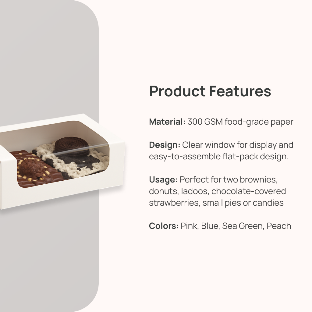 Pack your sweet treats beautifully with Mudrit’s Bakery Box with Window. Designed to hold two brownies or assorted desserts, this peach-colored box features a clear display window and sturdy, food-grade construction—perfect for bakeries, cafés, home bakers, and gifting.